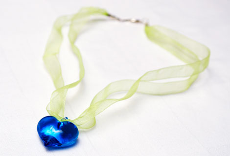 This necklace is also available as a blue heart with lime organza ribbon (see below).